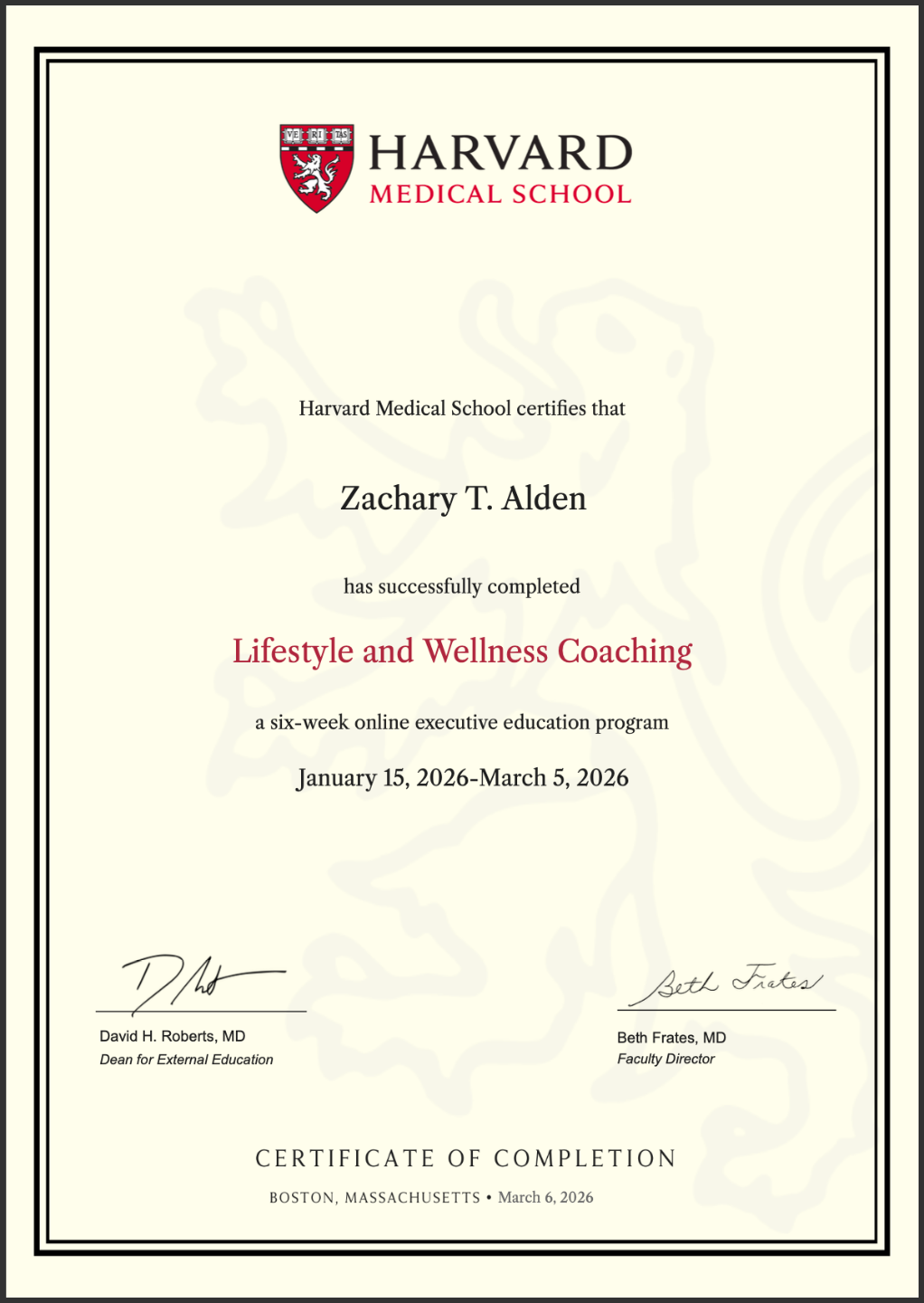 In the spring of 2026 I completed the Harvard Medial School Health and Lifestyle program to understand the latest techniques for addressing and supporting lifestyle changes.